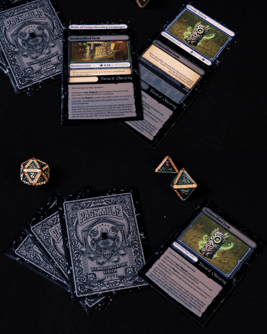 These are opaque, single-card protective sleeves (the kind you’d normally use to protect trading cards during play)… with one key twist: they’re built specifically to support the 5e "unidentified item" rules (remember those? they're pretty tough to implement with just pen & paper)!